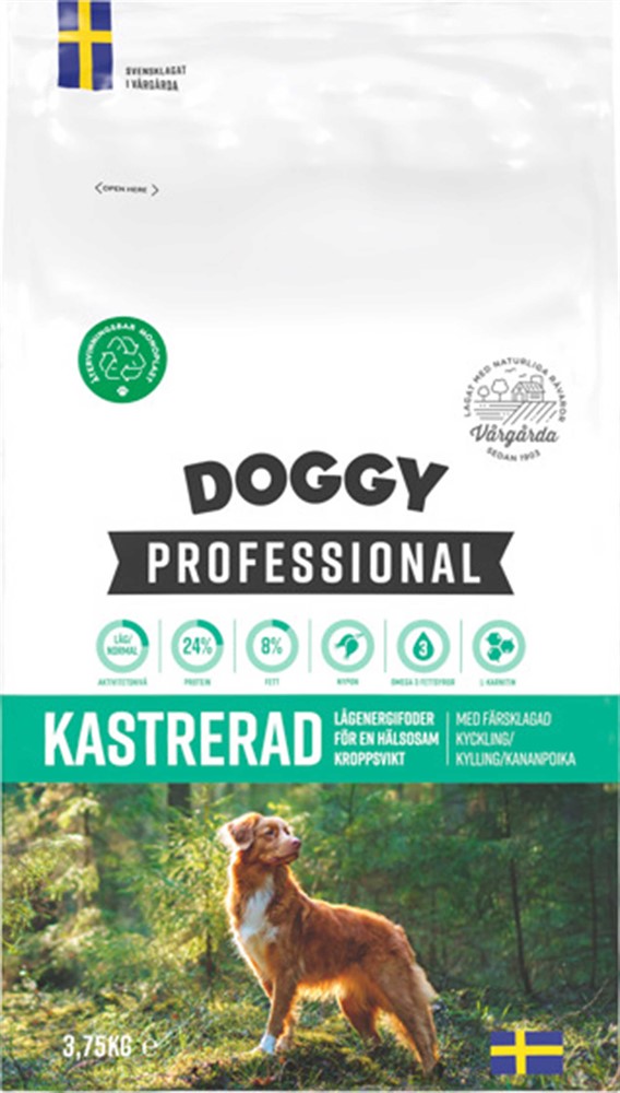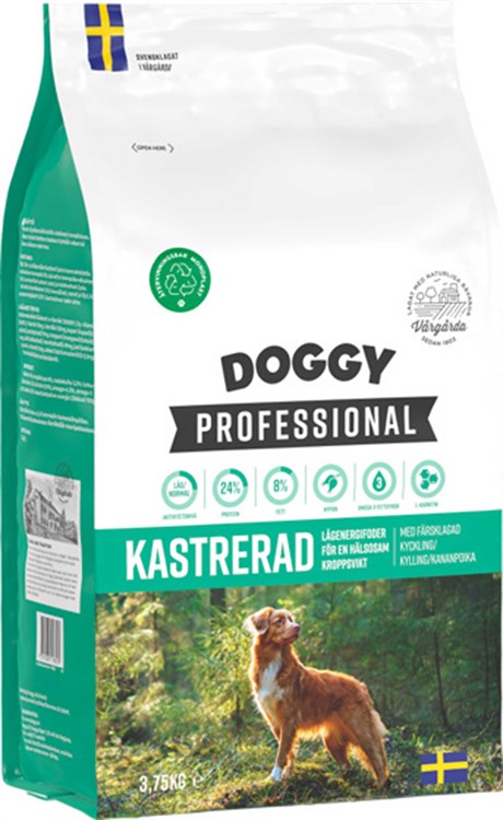 Doggy Professional Kastrerad är ett helfoder med lägre energiinnehåll, särskilt framtaget för kastrerade hundar eller hundar som behöver hjälp att behålla en hälsosam vikt. Med färsklagad svensk kyckling, potatis och noggrant utvalda råvaror är det både smakligt och näringsrikt. Fodret är berikat med nypon, rika på vitamin C och antioxidanter, samt Omega-3 från fisk, L-karnitin och extra vitaminer och mineraler. Tillverkas i Vårgårda. Serveras torrt eller uppblött.