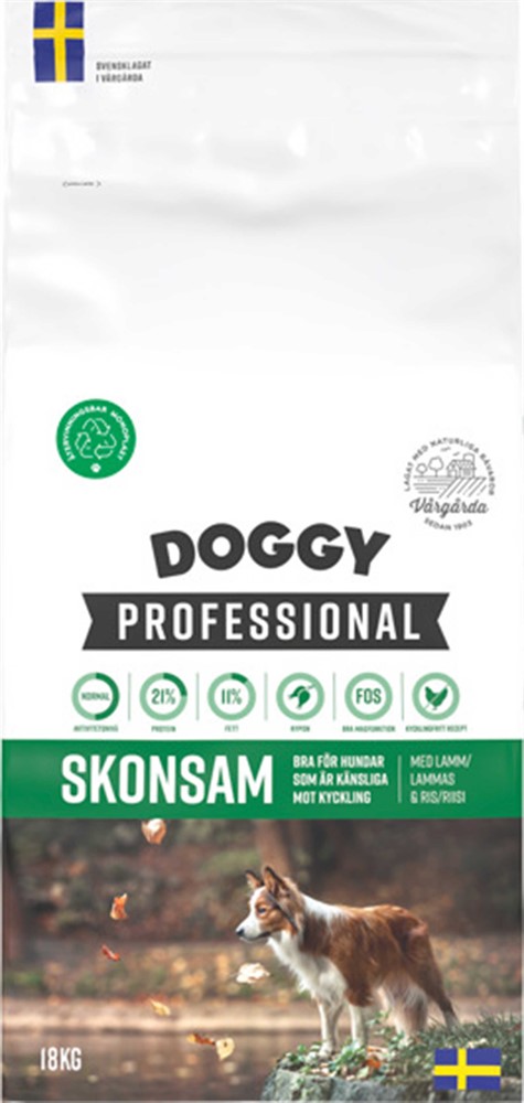 Doggy Professional Skonsam är ett helfoder utan kyckling, särskilt framtaget för hundar med känslig mage eller foderintolerans. Det innehåller färsklagat lamm och lättsmält ris, vilket gör det både skonsamt och välsmakande. Fodret är berikat med nypon, Omega-3 från linfrö, L-karnitin samt extra vitaminer och mineraler för att stödja hundens hälsa. Prebiotikan FOS främjar en balanserad tarmflora. Tillverkas i Vårgårda av noggrant utvalda, naturliga råvaror.
