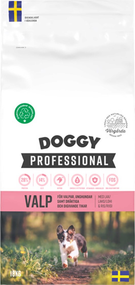 Doggy Professional Valp är ett helfoder speciellt framtaget för valpar och unga hundars behov, och passar även dräktiga och digivande tikar. Fodret innehåller färsklagad lax, rik på omega-3-fettsyror som stödjer valpens utveckling, samt nypon, L-karnitin, extra vitaminer och mineraler för en balanserad och näringsrik kost. Prebiotikan FOS bidrar till en hälsosam tarmflora och en välfungerande mage. Tillagas i Vårgårda med naturliga kvalitetsråvaror och kan serveras torrt eller uppblött.